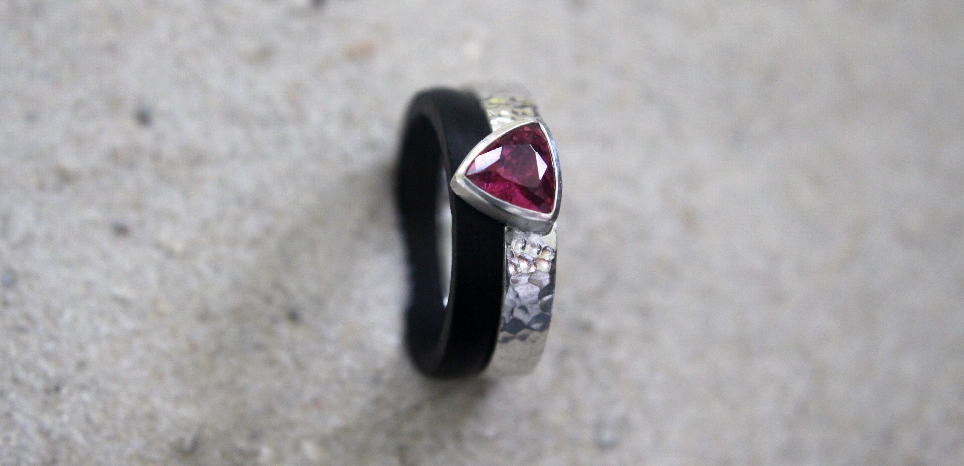 Die schwarze Farbe des Carbons bietet einen tollen Kontrast zu den Farben der Edelsteine, Edelmetalle und Perlen.