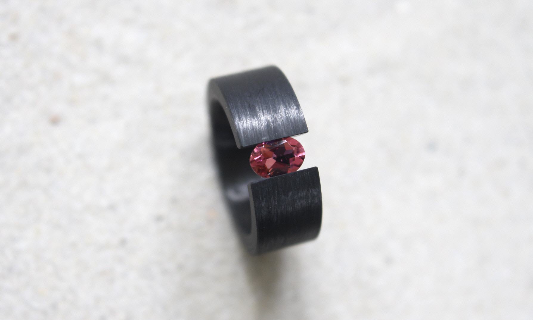 Die schwarze Farbe des Carbons bietet einen tollen Kontrast zu den Farben der Edelsteine, Edelmetalle und Perlen.